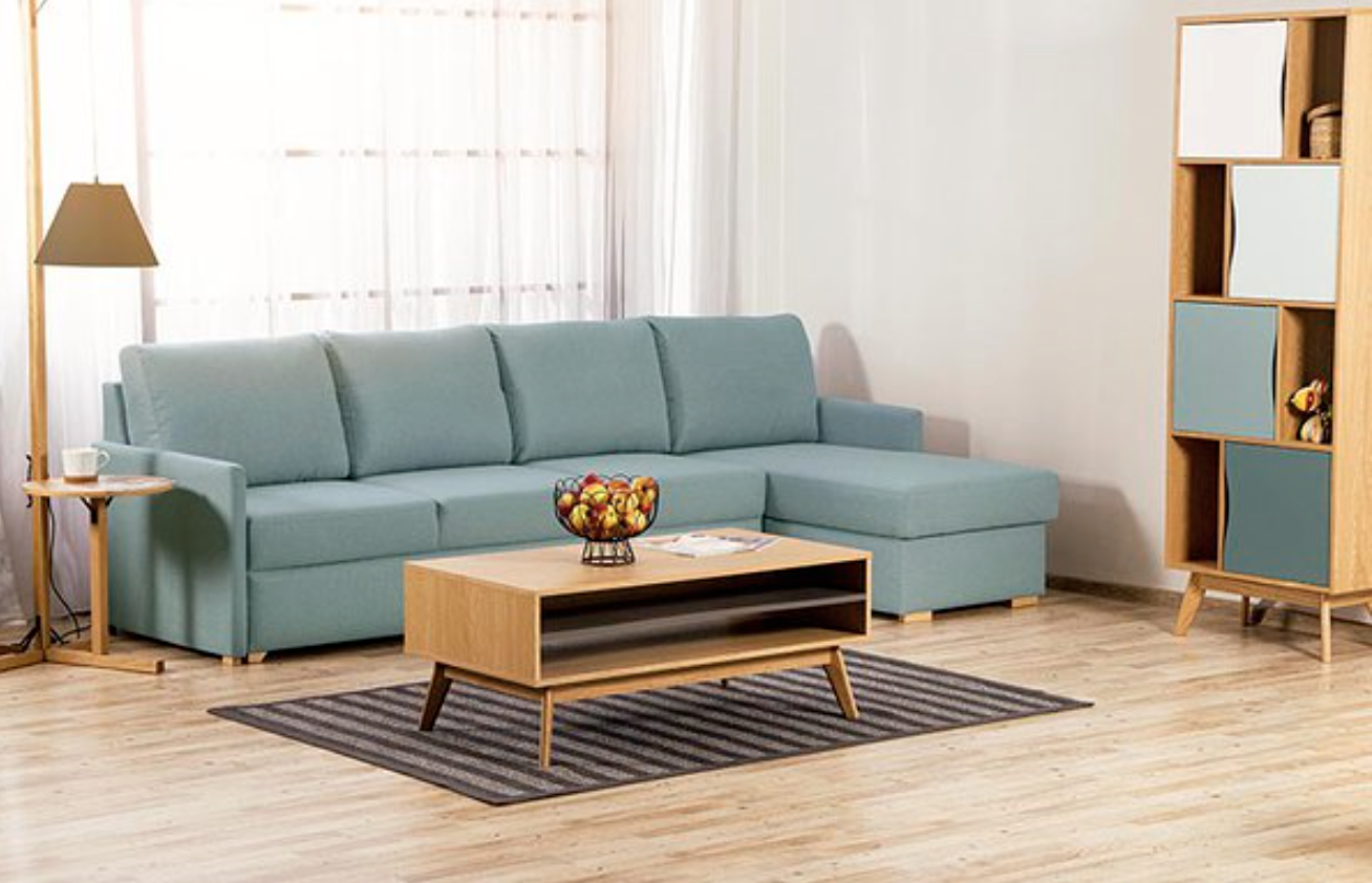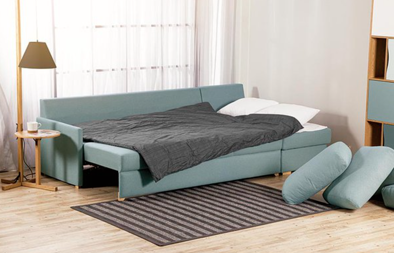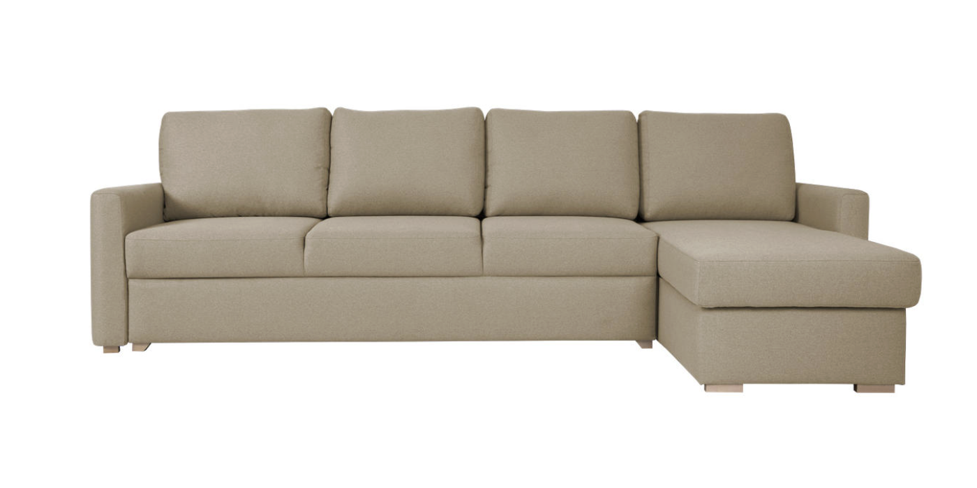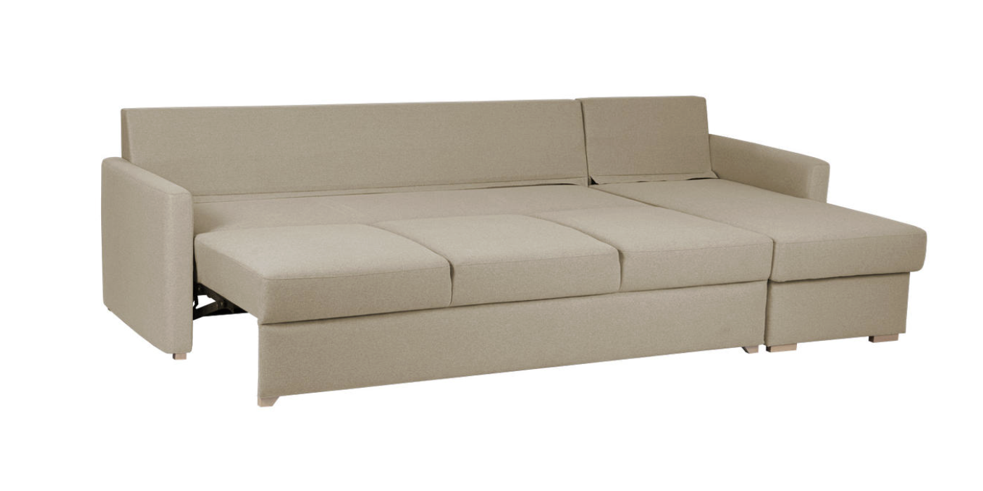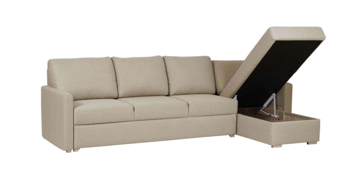 The soft seating and supportive backrest ensure comfort while sitting, while the chaise longue provides extra space to relax. The sofa easily converts into a full-size sleeping area, making it ideal for both daily use and accommodating guests. A built-in storage compartment in the chaise longue offers convenient space for bedding, blankets, or other items.