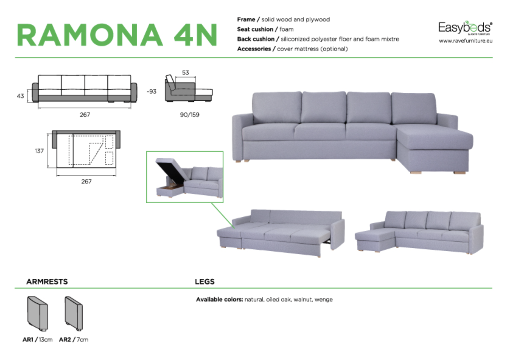 Sofa bed RAMONA 4N is a spacious and functional sofa with a chaise longue, designed for comfortable everyday lounging and restful sleep. Its classic shape, soft armrests, and well-balanced proportions allow it to blend easily into a wide range of interior styles—from modern to cozy and traditional.