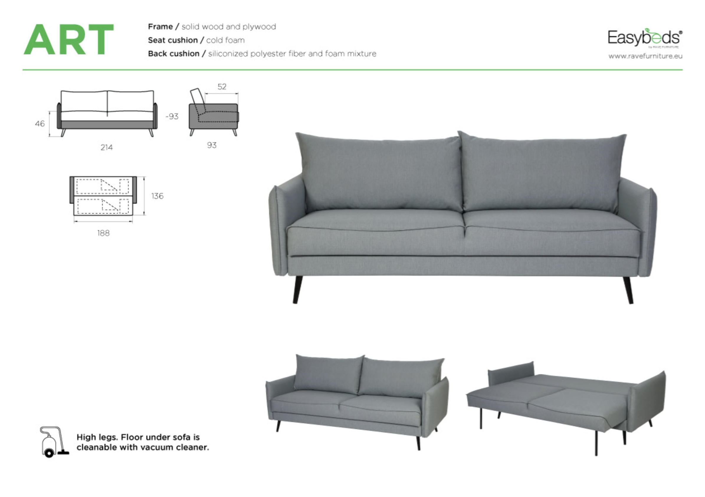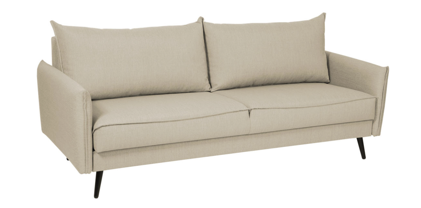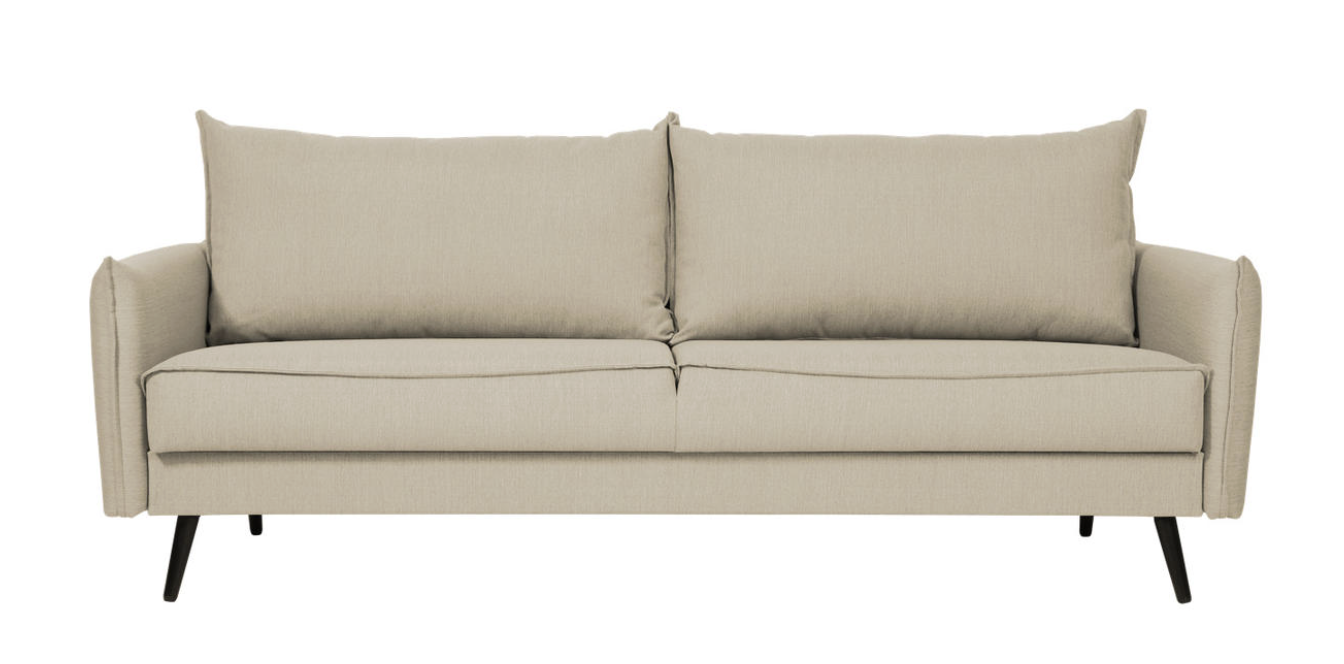 The sofa frame is made of solid wood and plywood, ensuring stability and long-lasting durability. The seat is filled with HR cold foam, providing a comfortable yet sufficiently firm seating and sleeping surface. The back cushions are filled with a mixture of siliconized polyester fiber and foam, making them soft, elastic and quick to regain their shape.