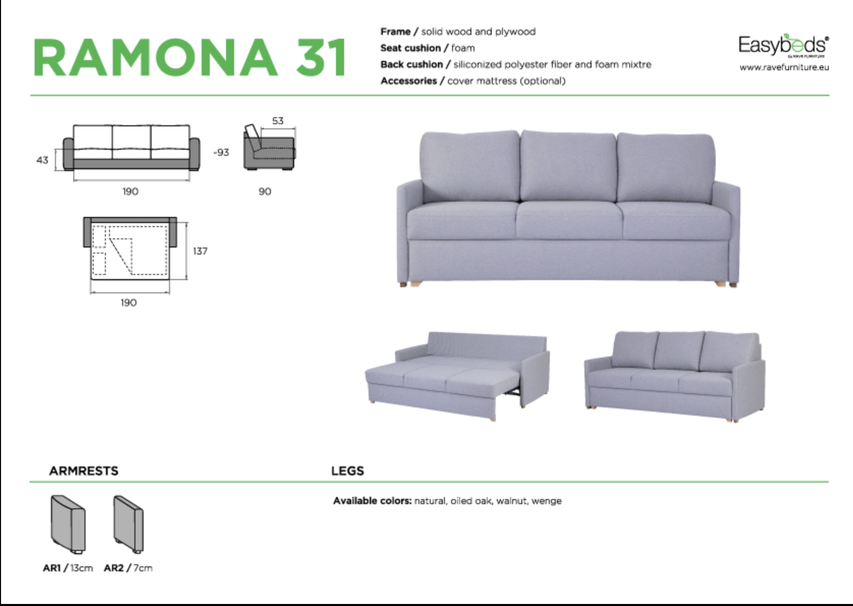 RAMONA 31 sofa bed is a spacious, comfortable, and functional sofa designed for everyday use and restful sleep. Its classic shape, soft armrests, and well-balanced proportions allow it to blend easily into a wide range of interior styles, from modern to cozy and traditional.