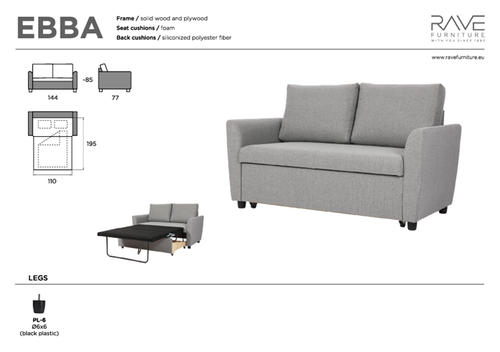 Kompaktiško dizaino sofa-lova EBBA – praktiškas ir stilingas pasirinkimas mažesnėms erdvėms ar svečių kambariui. Lengvai išskleidžiama lova suteikia papildomą miego vietą, o minkštos pagalvės užtikrina komfortą tiek dieną, tiek naktį.