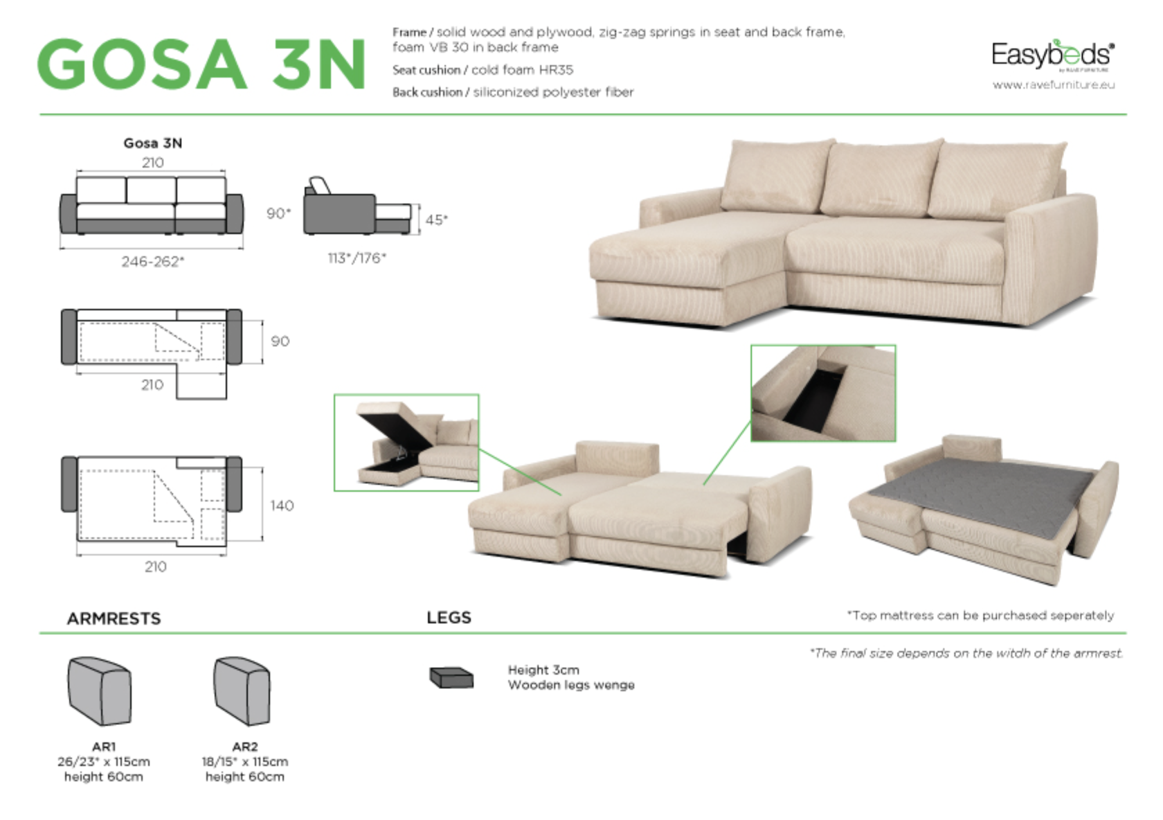 Sofa pasižymi tvirta konstrukcija ir elastinga sėdimąja dalimi, todėl yra tinkama tiek kasdieniam naudojimui, tiek svečių apgyvendinimui. GOSA 3N lengvai transformuojama į miego vietą, o integruotos patalynės dėžės suteikia papildomos vietos patalynei ar kitiems daiktams laikyti. Elastingas zigzaginių spyruoklių pagrindas suteikia patogų sėdėjimą ir padeda išlaikyti baldo formą ilgą laiką.