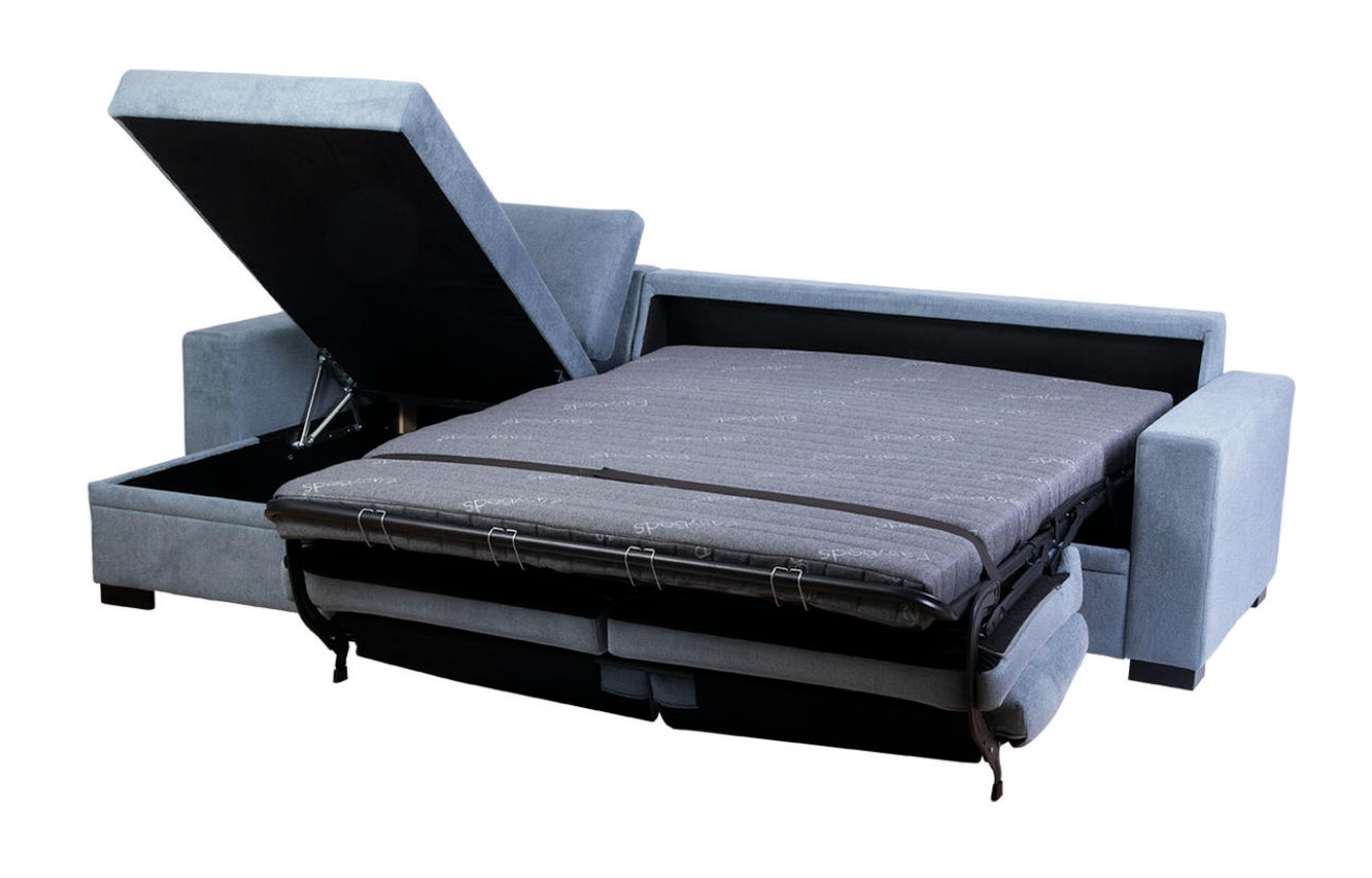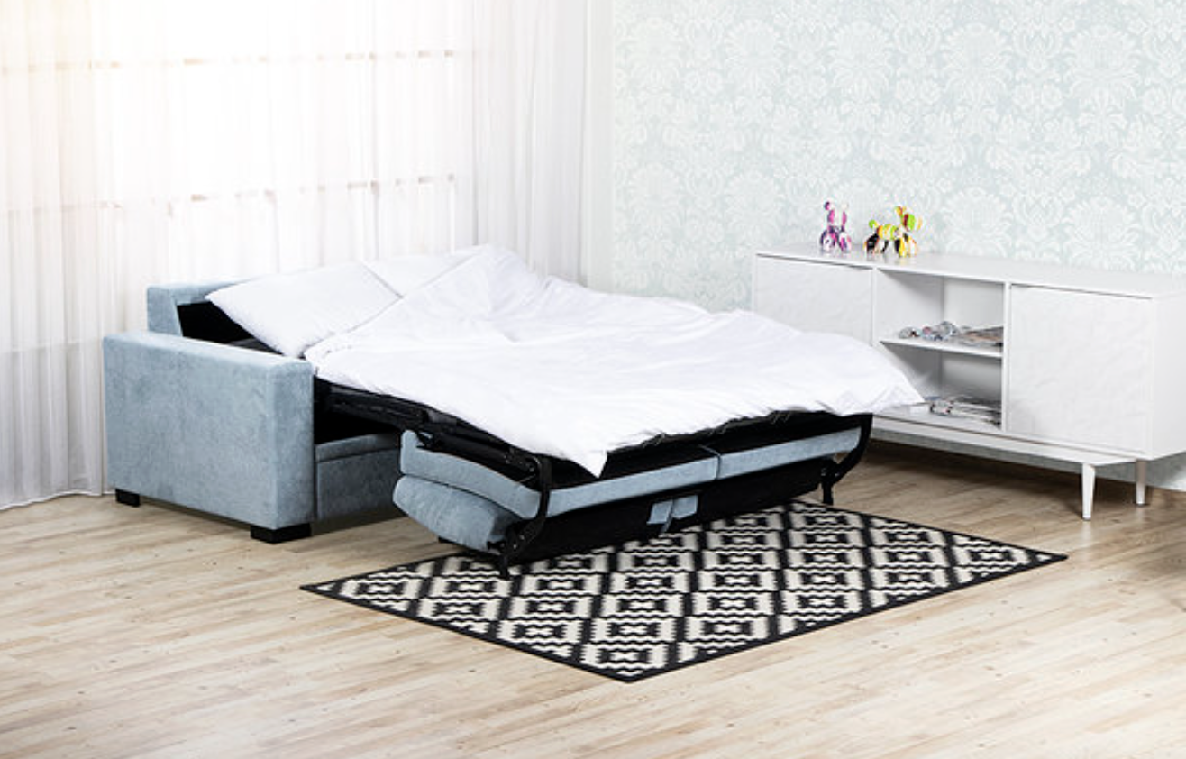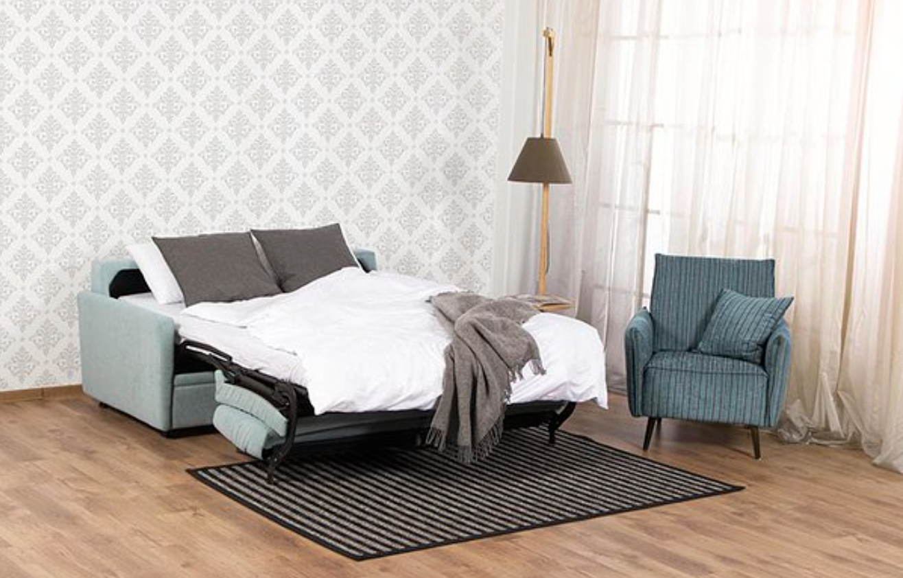 Sofa aprūpinta patikimu metaliniu išskleidimo mechanizmu su grotelėmis (lamelėmis), kuris užtikrina gerą atramą miego metu ir lengvą naudojimą. Išskleidus sofą, ji tampa pilnaverte miego vieta, tinkama tiek svečiams, tiek reguliariam naudojimui. Komfortiška sėdimoji dalis ir atlošas užtikrina patogų poilsį dieną.