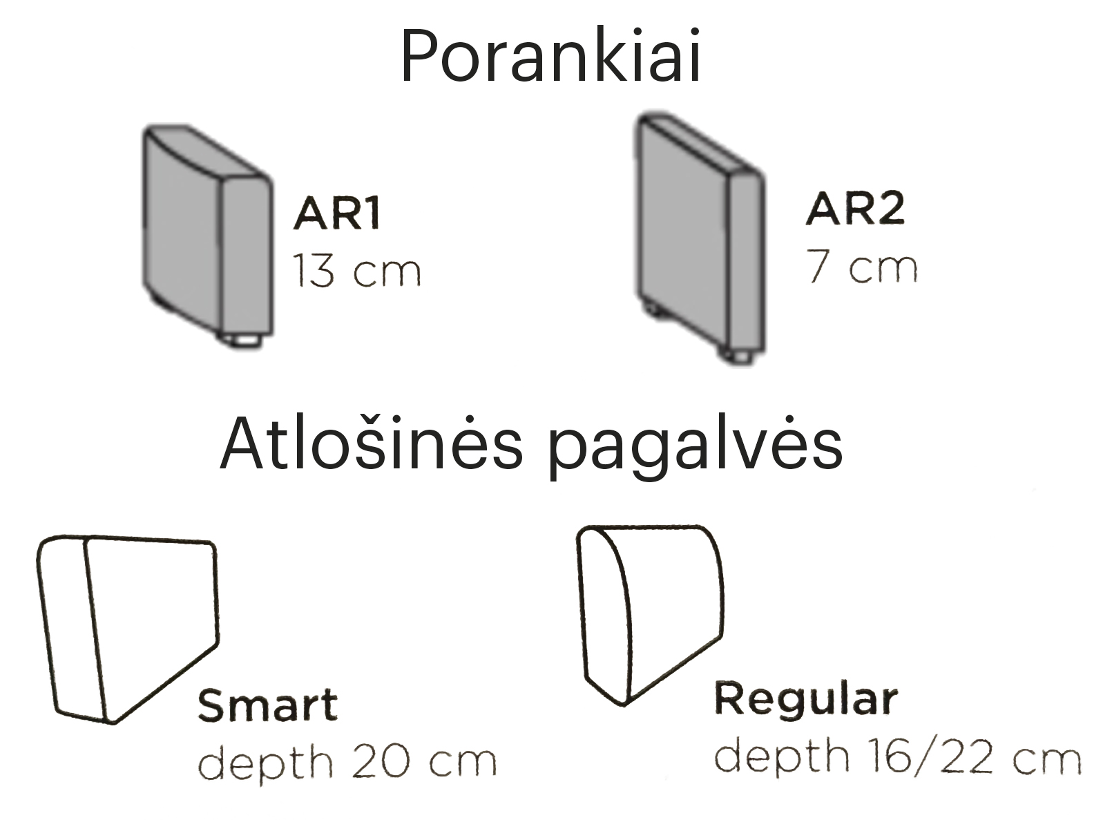216 × 93 × 85 cm (ilgis, plotis, aukštis) arba 204 × 93 × 85 cm (ilgis, plotis, aukštis); (išskleista miego vieta – 190 × 137 cm).