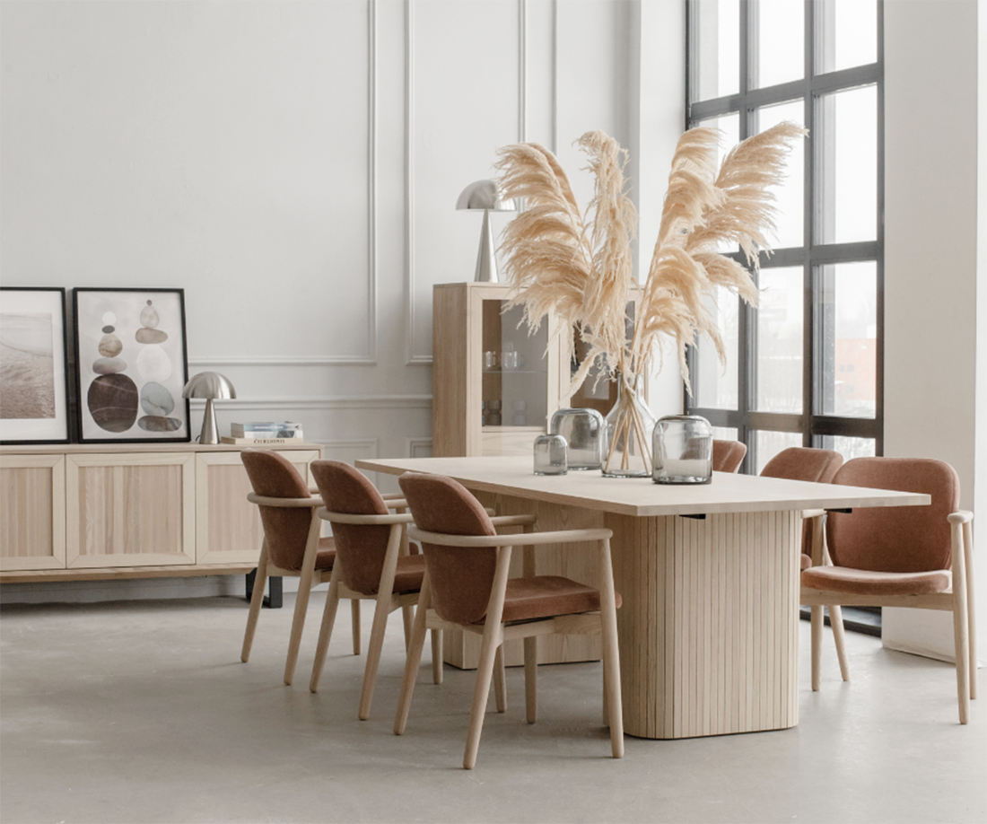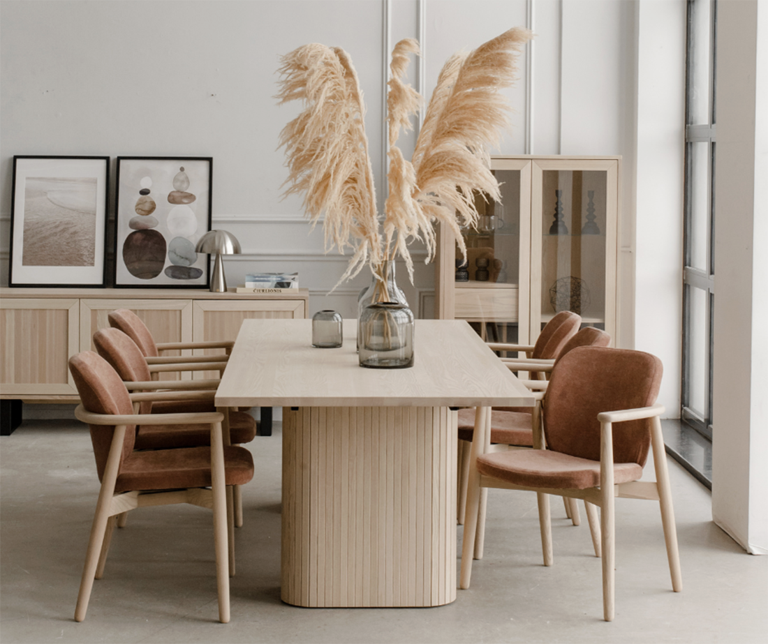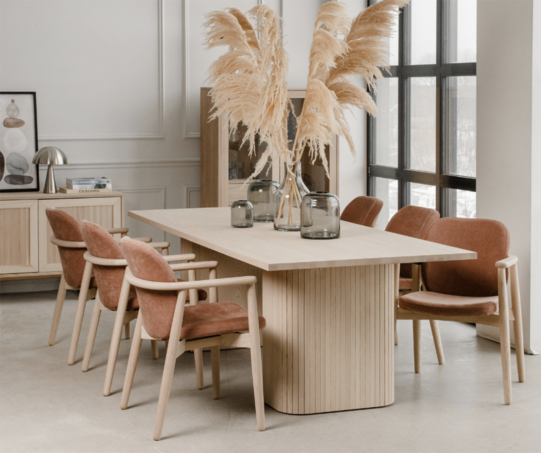 Natūralaus uosio baldai alyvuotu paviršiumi yra medžio dizainas, kuris keičia savo stilistiką nuo pasirinkto kojų dizaino ir medienos aliejaus spalvos.