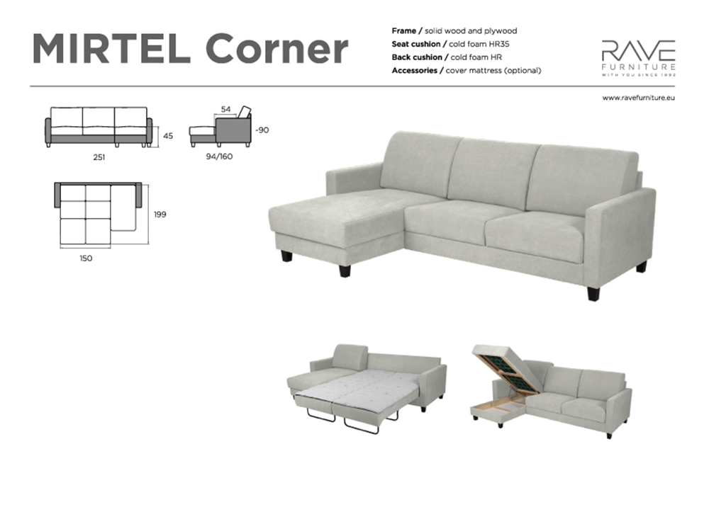 Moderni ir funkcionali sofa-lova MIRTEL Corner – tai puikus pasirinkimas ieškantiems komforto, praktiškumo ir šiuolaikiško dizaino viename balde. Tiesios linijos ir minimalistinė forma lengvai įsilieja į įvairius interjero stilius. Sofa greitai ir patogiai transformuojama į erdvią lovą, o šezlongas suteikia papildomo komforto poilsiui dienos metu.